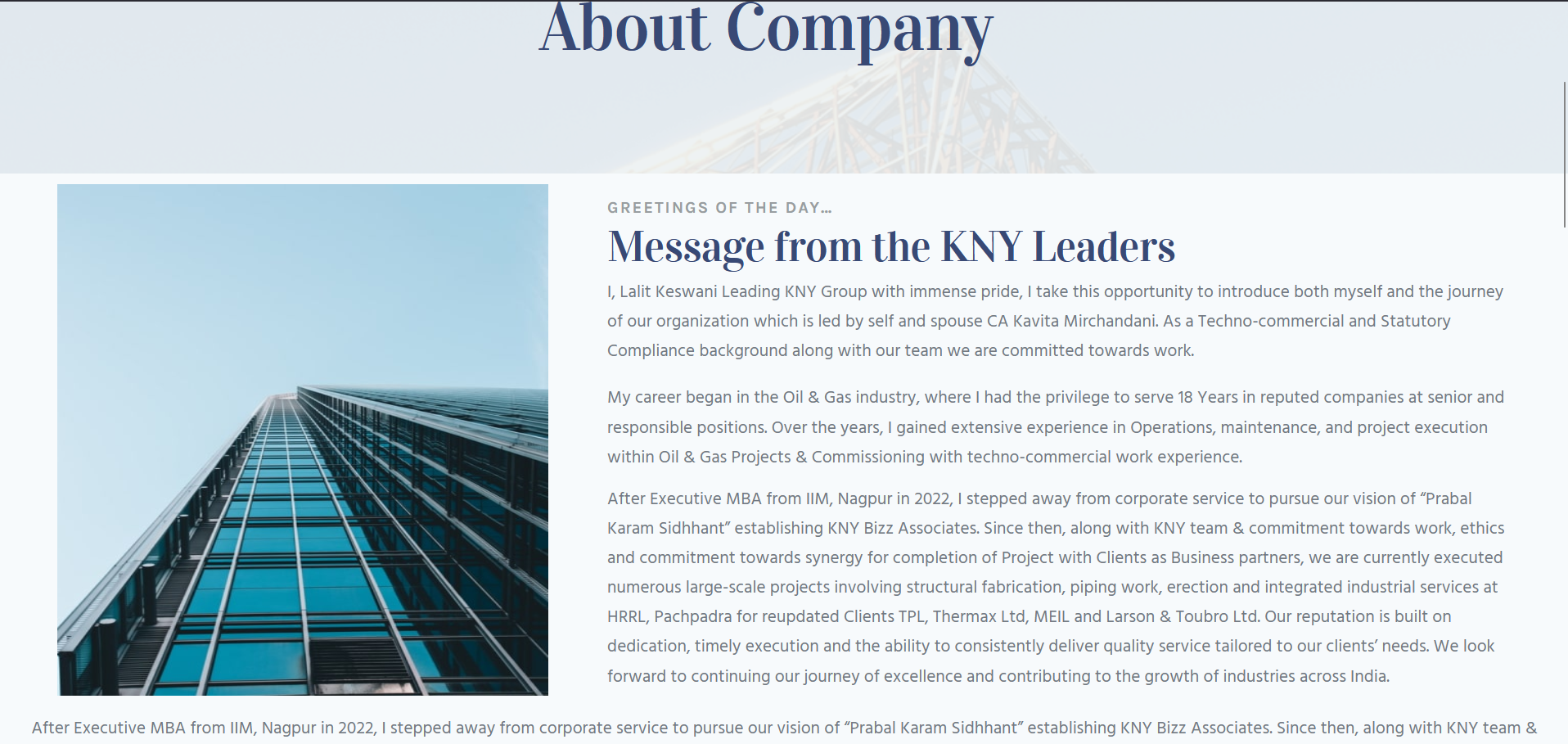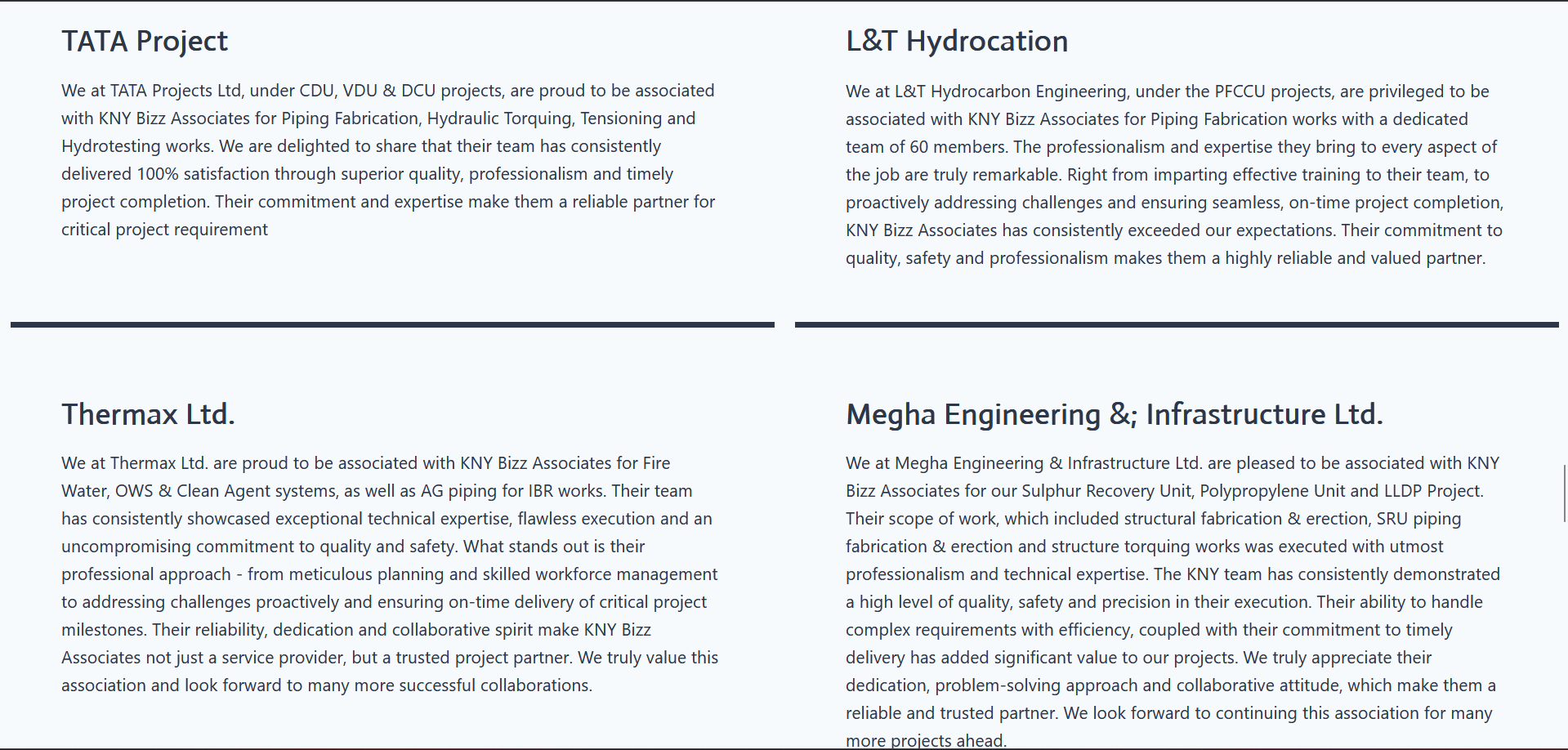 KNY Group has earned the trust of top industrial leaders like TATA Projects, L&T Hydrocarbon, Thermax Ltd., and Megha Engineering & Infrastructure Ltd. Our clients consistently appreciate our technical excellence, safety standards, and on-time project delivery, establishing KNY Group as a reliable and valued engineering partner across India.