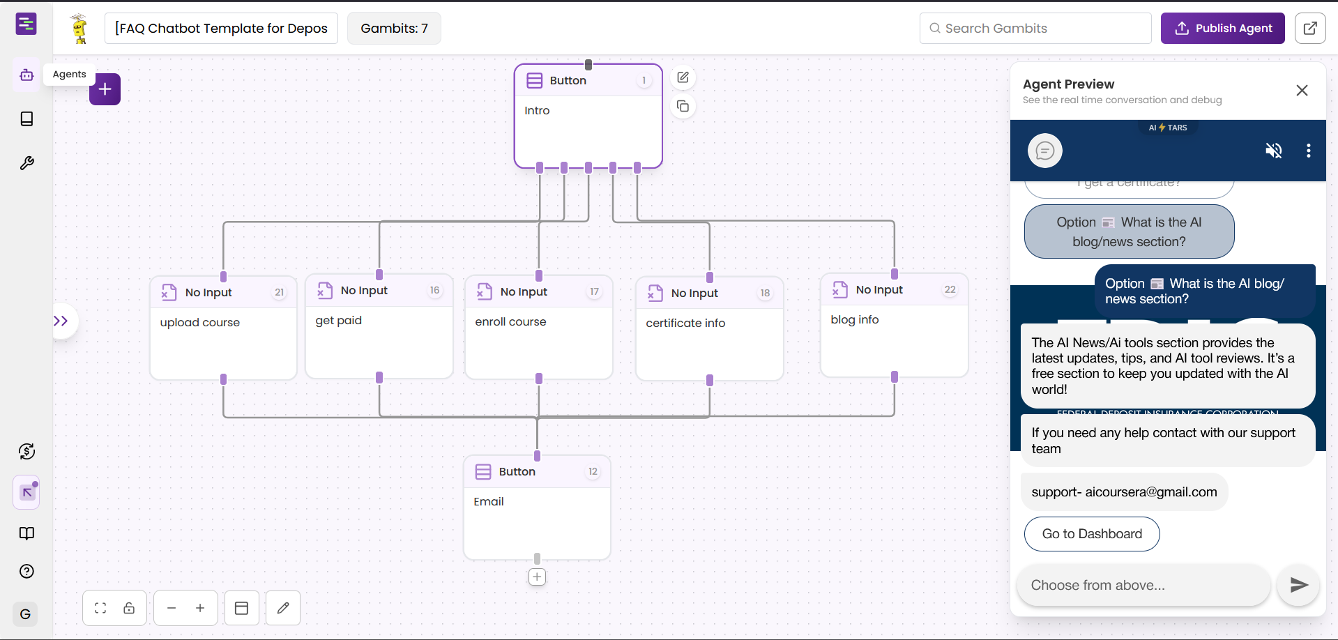This screenshot displays the completed chatbot architecture with clean, connected nodes. Each option—blog info, course details, certificate help—flows logically for users. It reflects my ability to design clear, user-friendly conversation experiences.